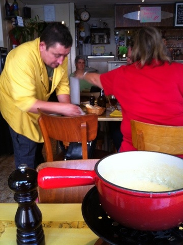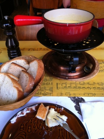 The food looks great, especially the wine. Did you drink it??!? What a great memory: your first fondue in Switzerland.