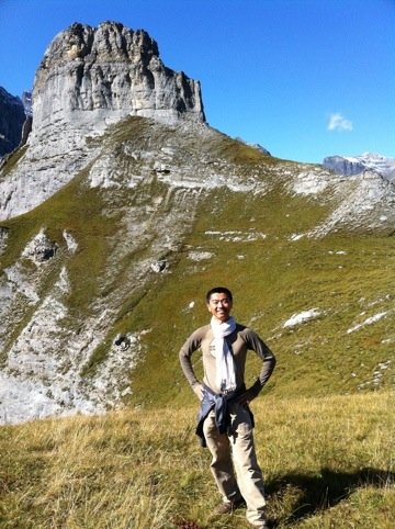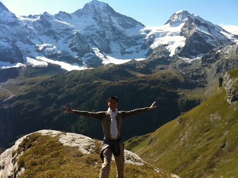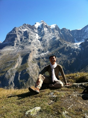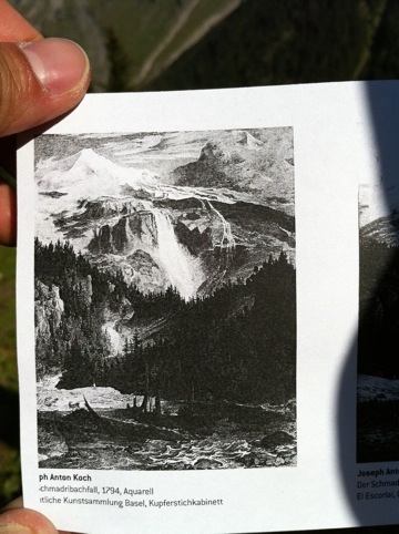 After breakfast, I went for a hike in Gimmelwald. Gimmelwald is not a busy place compared to Interlaken. It’s quiet, less tourists, and beautiful. The trail starts from Gimmelwald, and goes down to the valley, and up to the other side of the valley to Busenbrand. It is followed by a pretty challenging climb all the way to Tanzboden (1978 meters or 6489 feet high) with an amazing view, and a flat space up in the mountain. The guy at the pension told me they call it Russian dance floor. Then the trail takes a narrow route to Obersteinberg. I took the path to Tschingelhorn hotel to see if they have the dinner that I like. They didn’t (see below) so I hiked down to Stechelberg and had my dinner at the Stechelberg hotel. I hiked with a Swiss couple at the beginning of the trail. I ran into another Swiss couple at Tanzboden, and hiked with them all the way to Obersteinberg. We had a nice conversation during the lunch break at the Obersteinberg hotel, where I had a piece of plum pie with a bottle of coke for lunch. They are fun couple. The husband Bruno got me to take a picture on a rock at the edge of the Tanzboden. Boy, it’s really high up in the mountain. Some parts of the trail are really exciting. At times, I felt I was hiking at the edge of the mountain. Other times, I felt there is no way for me to go up further, or come down safely. There were not many people hiking today. Although the hike was challenge, taking me 6-7 hours to finish, the view was wonderful. I was lucky that today is another beautiful sunny day. That means, I got more sunburn today… Oh, well. I also ran into an older hiker, who went for the hike to seek for the landscape painted by an Austrian painter Joseph Anton Koch. He showed me a photocopy of a painting from 1794, with the water fall in the background. The actual water fall was right in front of us over the valley. I thought it was very interesting. It was very nice of him showing it to me.