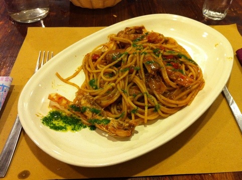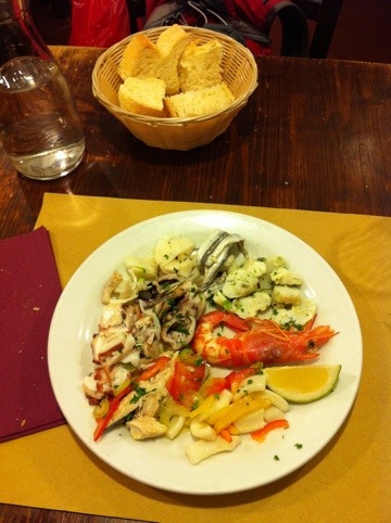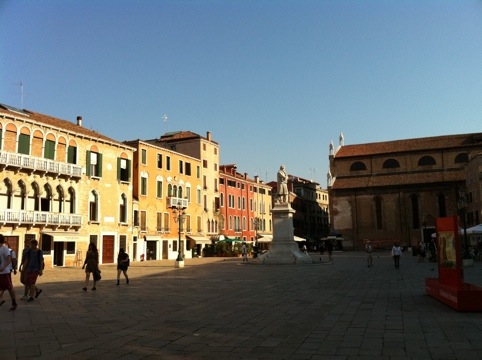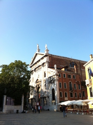 There are a lot to see. I was getting tired. So I took the water bus again and went to the Dorsoduro area for dinner. The streets and canals were just so complicate that I couldn’t figure out where I am. I ran into a Japanese/Chinese tea room. I got some help from the couple, who owns the tea room and also operates a B&B. One is Chinese and the other is Italian. There were extremely helpful. Not only they gave me a good idea of the area, they also recommended a seafood place for my dinner (4 Peri, just near their tea room). The dinner won’t be served until 7:30pm. I took a walk following their recommendation. I didn’t expect it but noticed a shop making mask. It is one of few still exist, that produce the mask by hand. The shop was featured in National Geography magazine. I saw one that I like and decided to bring one home. I hope I can bring it back in one piece. The dinner was fantastic. I just followed whatever the waitress’s recommendation. I got a mixed seafood appetizer, and a pasta dish with the mixed of pesto and tomato sauce. That brought the energy back to me. πŸ™‚ I realized that I had time to catch another concert by the same group last night. So I did! In addition to Vivaldi, they also played Mozart, Bach, and Schumann tonight, with their own arrangements. This group is very energetic, but not over the top. It’s very entertaining to listen to them. To end the night, two more scopes of gelato for me. I am ready for bed! The plan fir tomorrow is to explore the Venice in the morning, and catch the the train to Florence. I am pretty sure that I have a seat reserved this time!