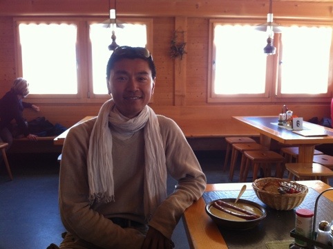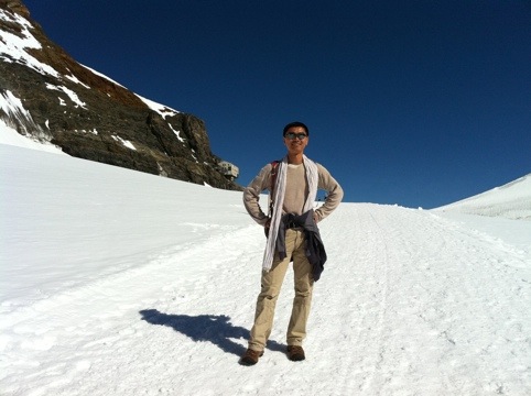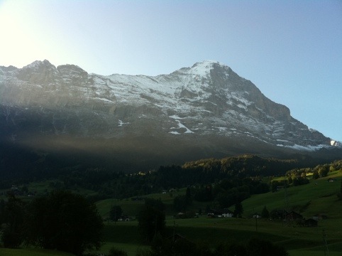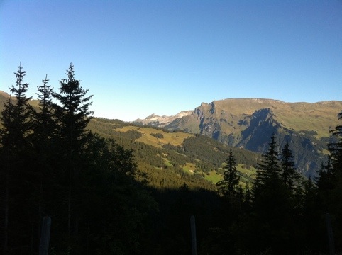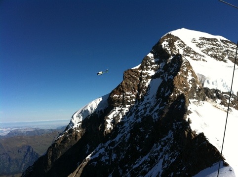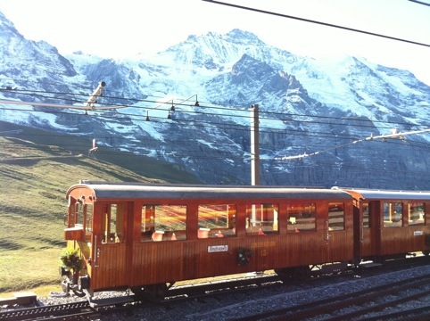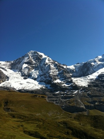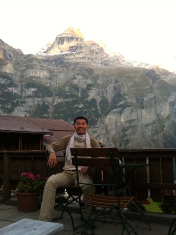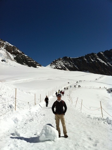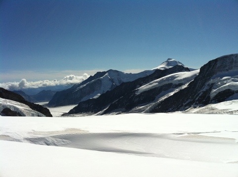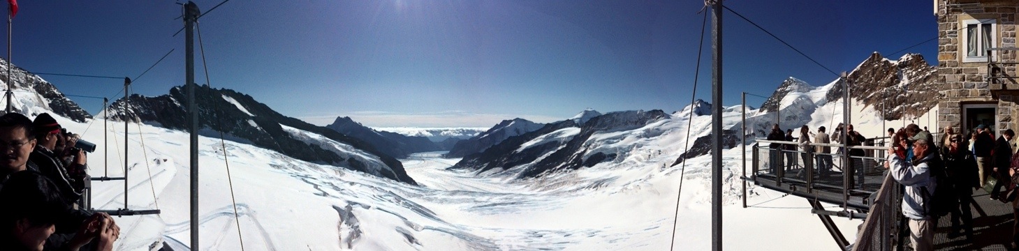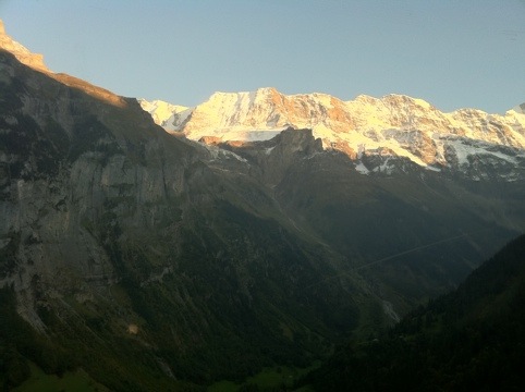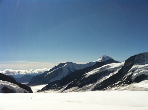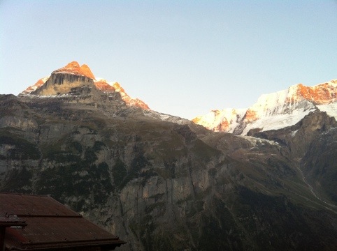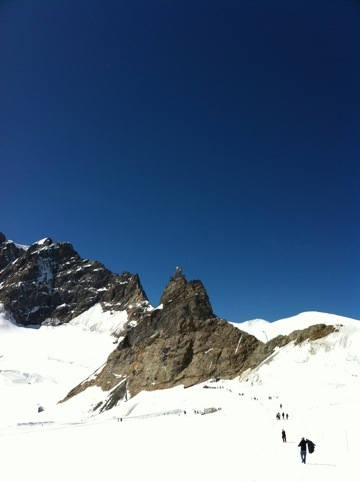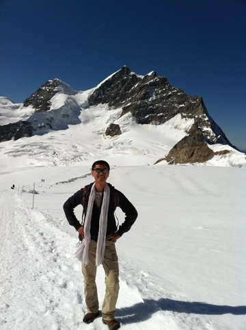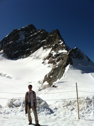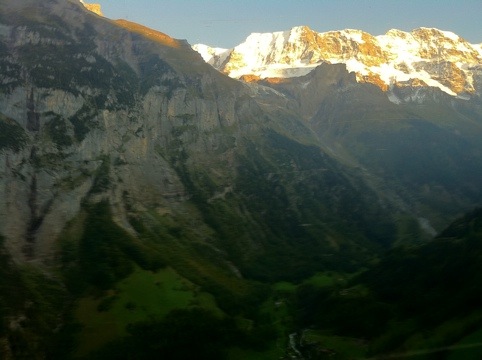 My plan today is taking the train to explore the Jungfrau region. The weather was excellent today – blue sky and sunny. My EuroRail pass doesn’t cover this part of special/regional ride. I would have to pay extra to take the train. I went a head and got the ticket for a loop of the ride in the region. I wasn’t planning to go to the top of Europe (Jungfraujoch), which is the highest train station in Europe and can only be reached as part of the loop. After the first part of the train ride with the gorgeous weather, I really enjoyed the magnificent scenery. So, I decided to head to the top of Europe. It was a wonderful experience. The mountains are just incredible. I went up to the Shpinx observation terrace. I also took a hike through the glacier and reached the Monchsjoch hut. My hiking boots are not really designed for the hike on snow. The biggest challenge is the-air-is-ve-ry-thin. I was out of breath every couple of minutes. However, the view was just magnificent. I reached the hut right after the lunch time. I didn’t plan to hike today so I was extremely hungry. There is a little restaurant in th hut, where I got some soup with sausages and bread for lunch. So I can be recharged to hike back. Boy, I was tired afterward. After I checked out the plateau and the ice place at Jungfraujoch, I headed back to Interlaken, and took the train to Lauterbrunnen. Followed by a bus to Stechelberg and a cable car ride, I arrived in a small town Gimmelwald in the Jungfrau region. It will be my home for two nights. The pension here is cute with a Swiss style. I had a nice plate of pasta for dinner, while sitting at the patio and enjoying the reflection of the sunset on the mountain. It’s a quiet, beautiful, and relaxing town in the deep mountain. I am looking forward to hiking in this area tomorrow.