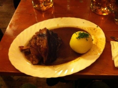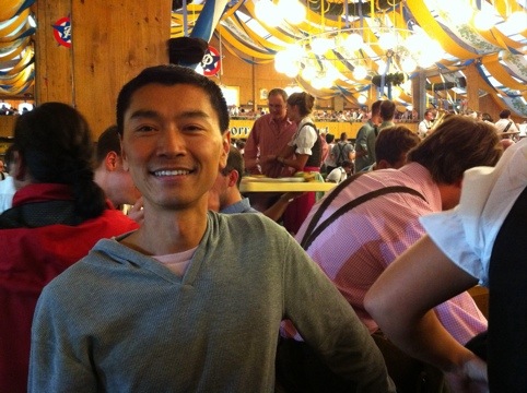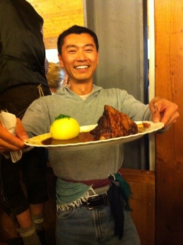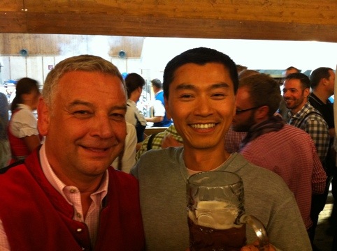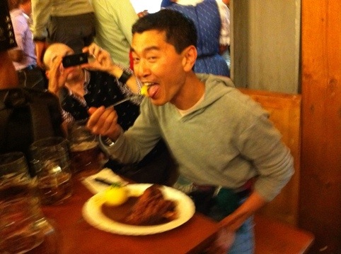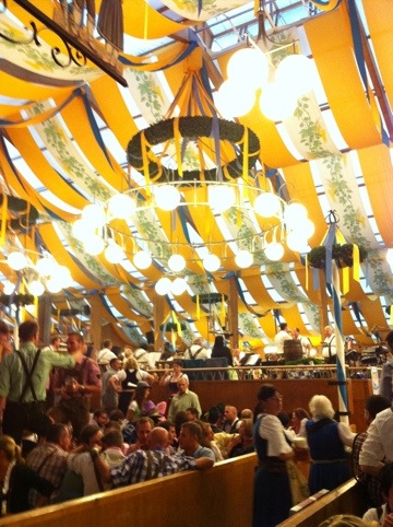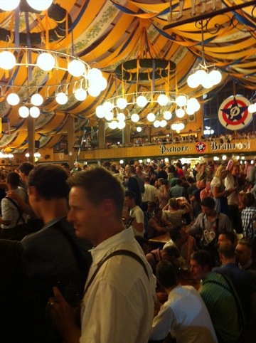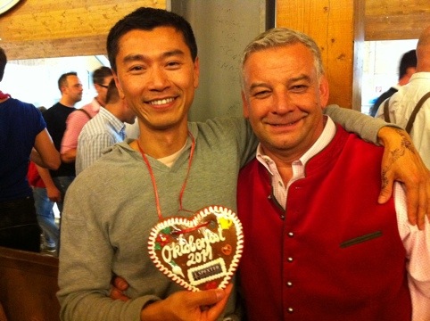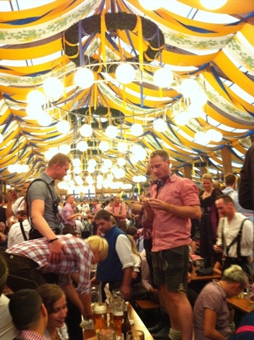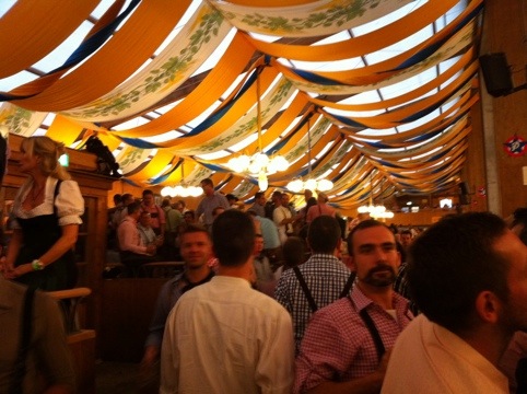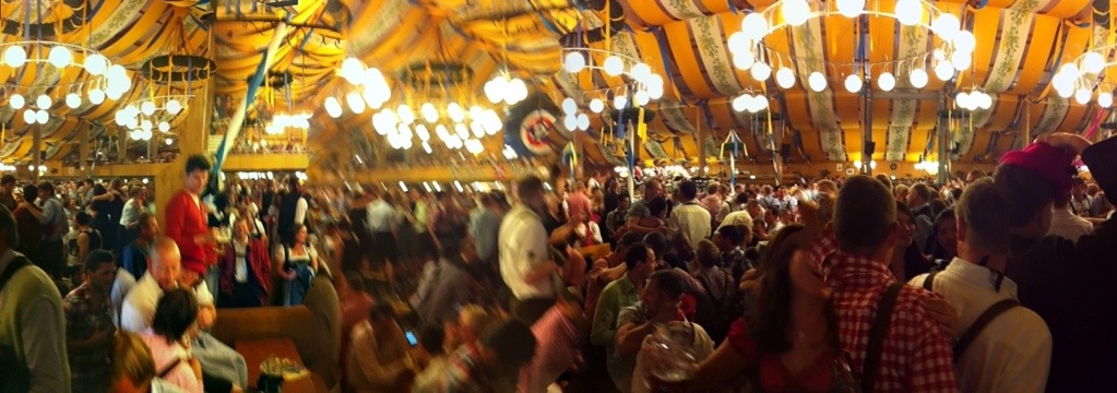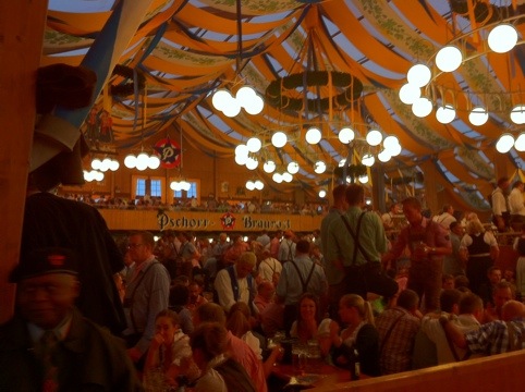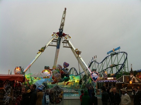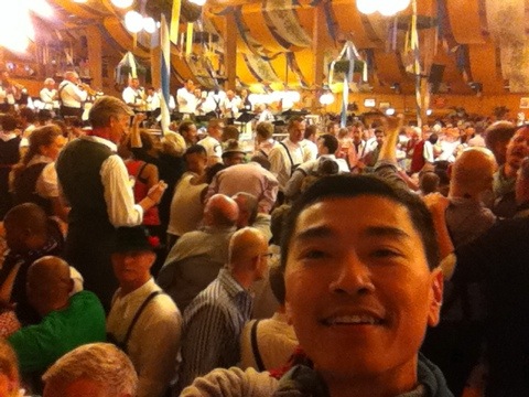 It’s pretty easy to find where it is located – just followed the people with traditional bavarian clothes. It looked like a carnival in the Theresienwiese ground when I arrived. What I didn’t know is there are 14 beer halls, in addition to some smaller beer tents. These halls or tents are built every year just for the fest. I picked one beer hall (Bräurosl – True Wiesn tradition), walked in, and boy, it was amazing. The tent is huge, filled with people drinking lots of beer, dancing on the benches, singing alone with the band, and having a good time. There was also a huge kitchen for supplying food, and two levels on each side of the hall. I found a spot that was relatively comfortable since it was extremely pack inside. The security guys were every where, and the wait staff had no problem to push people hard to get around. I also made some new friends. A man and a woman pretty much took care of me the rest of the evening in the beer hall. The guy handed me a heart shape cookie for me to wear on. The woman told me that “you know this is the homosexual hall right? It only happens this Sunday very year”. I asked her “why you came here?” She simply said: this hall is the best and the most fun compared to other tents! It’s an eye opening experience. They helped me order my dinner at the hall with bavarian flavor (a pork shank and a potato ball which is jelly like. It tasted great! I even had a couple sips of the beer, with the encouragement from the people at the table. I am not a drinker nor a party animal. From what I saw in the tent, this is probably the biggest party that I know of. It would put Vegas to shame… People would sing “Sweet Caroline” one moment, a German song later, or followed by a marching band song. It’s crazy… And there are still 13 other tents! I am glad I went to see with my own eyes. My German friends here told me this is their once a year big party. After the beer hall stopped at 10:30pm, I haven’t seen there were so many drunk people on the street. It’s really funny!