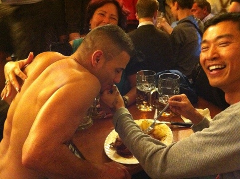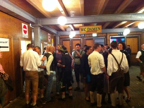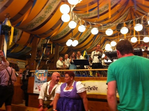 That was crazy. I was eating my dinner and folks made sure that I would eat the skin of the pork shank. The skin is crunchy with a good deal of fat under it. Very tasty. This guy, clealy drank “some” beer already, asked a piece of skin to snack with the beer. What the hack, I fed him a piece by hand. He went for it. It got a really good laugh at our table. No, he still had his bottom clothes on, the shorts they wear during the fest. Some of the clothes were really nice.
