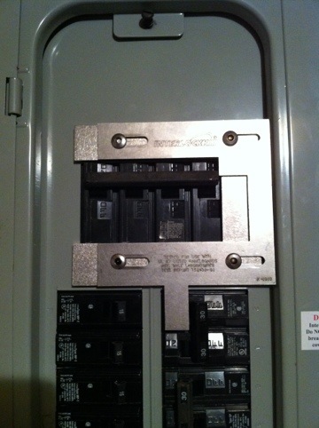 I finally got a portable generator. I had an electrician to wire an outlet outside of the house to the main electrical panel. Instead of a transfer switch, I put in an interlock plate. As a safety measure, I can only turn on the main power, or use the portable generator. Now I am ready for out of power – hopefully it won’t happen often. The interlock plate looks pretty neat!