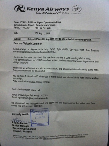 After I arrived in Bangkok, Kenya Airway delayed the plane for 9 hours. They put the passengers at a hotel in Bangkok. The flight will get me to Nairobi at 2:40pm, which is still ahead of my meeting time at 6pm. The hotel is kind of nice. Will get some Thai food for dinner and shower. Oh, I obviously don’t have any changing clothes with me. 🙂